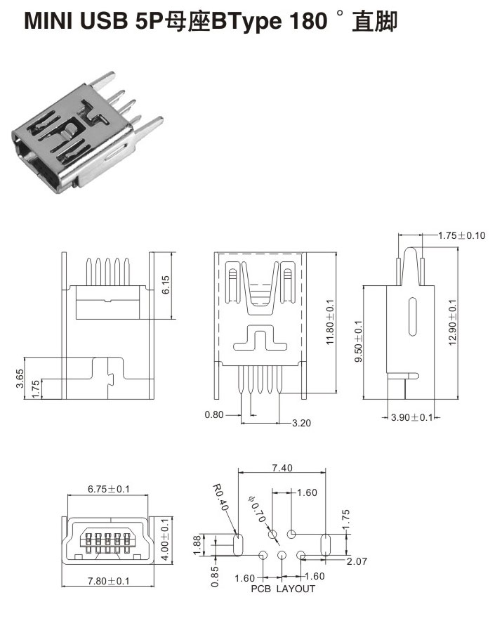 MIMI USB 5P母座BType 180°直腳